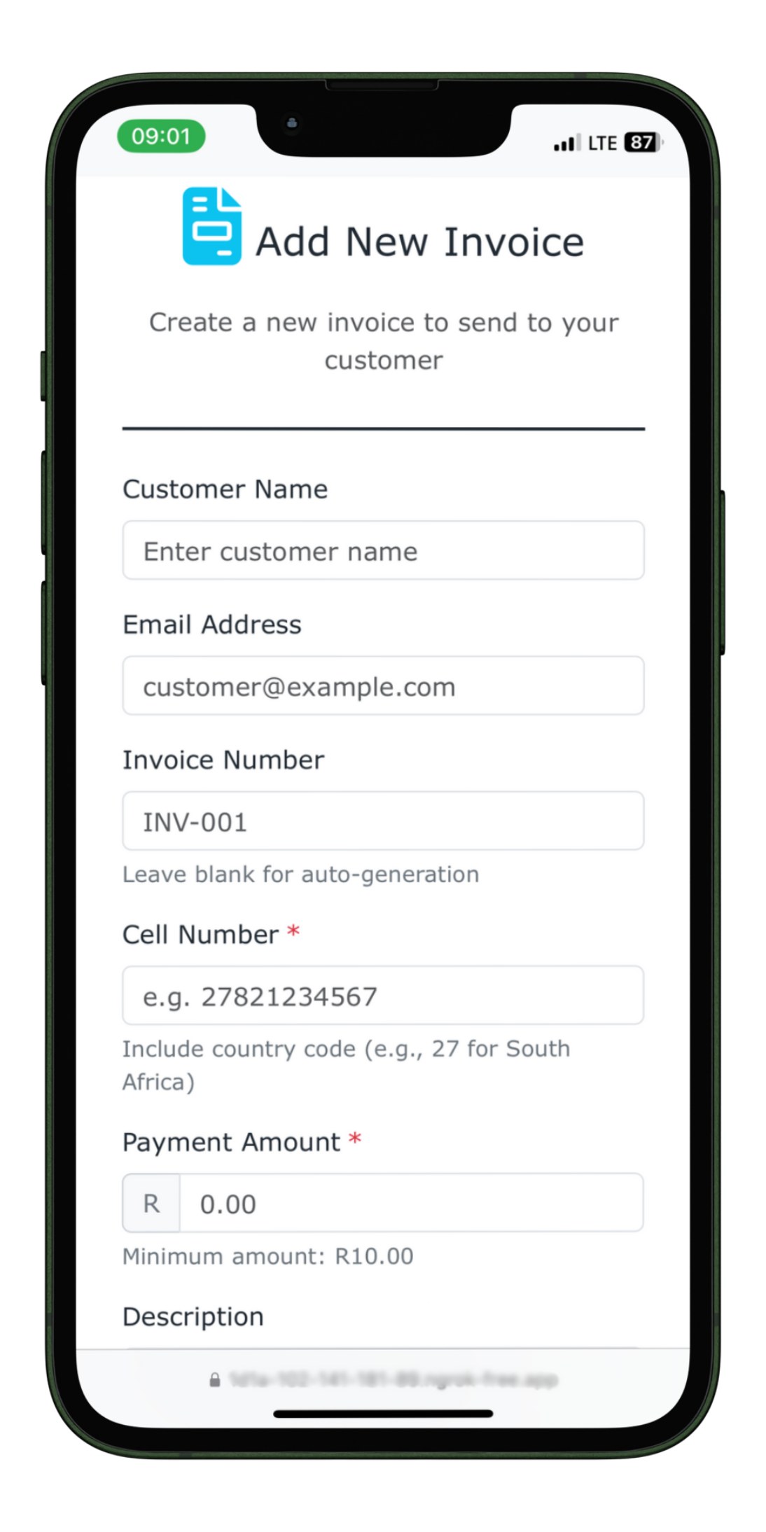Enter customer information, amount, and description.